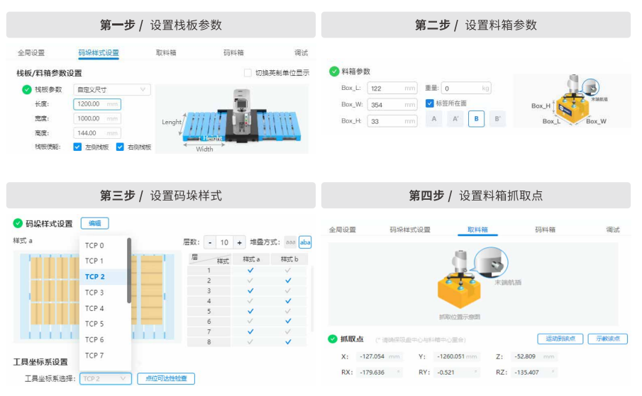 越疆碼垛工藝包無需編程,4步完成工藝設置,10分鐘投入生產。