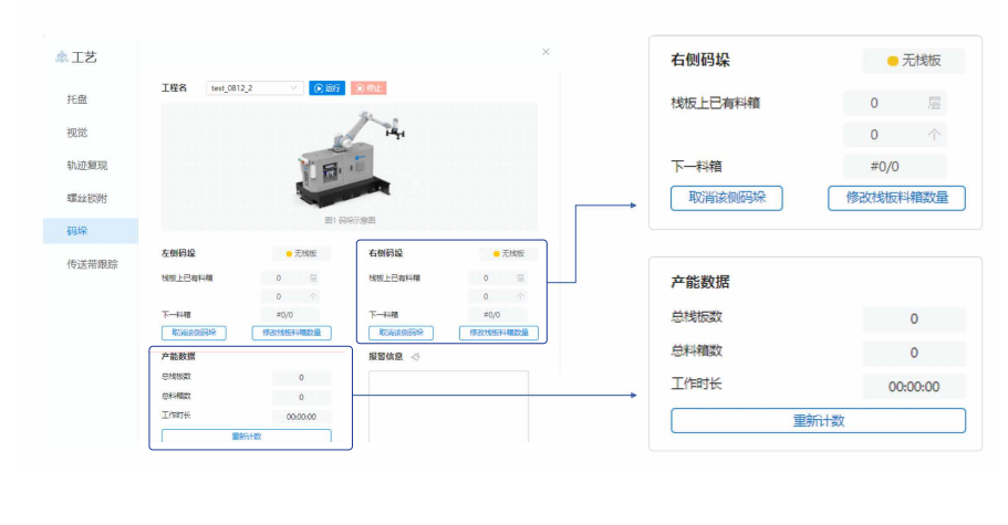 越疆碼垛?藝包運?界?可實時監控設備狀態,還能清晰記錄產能數據。