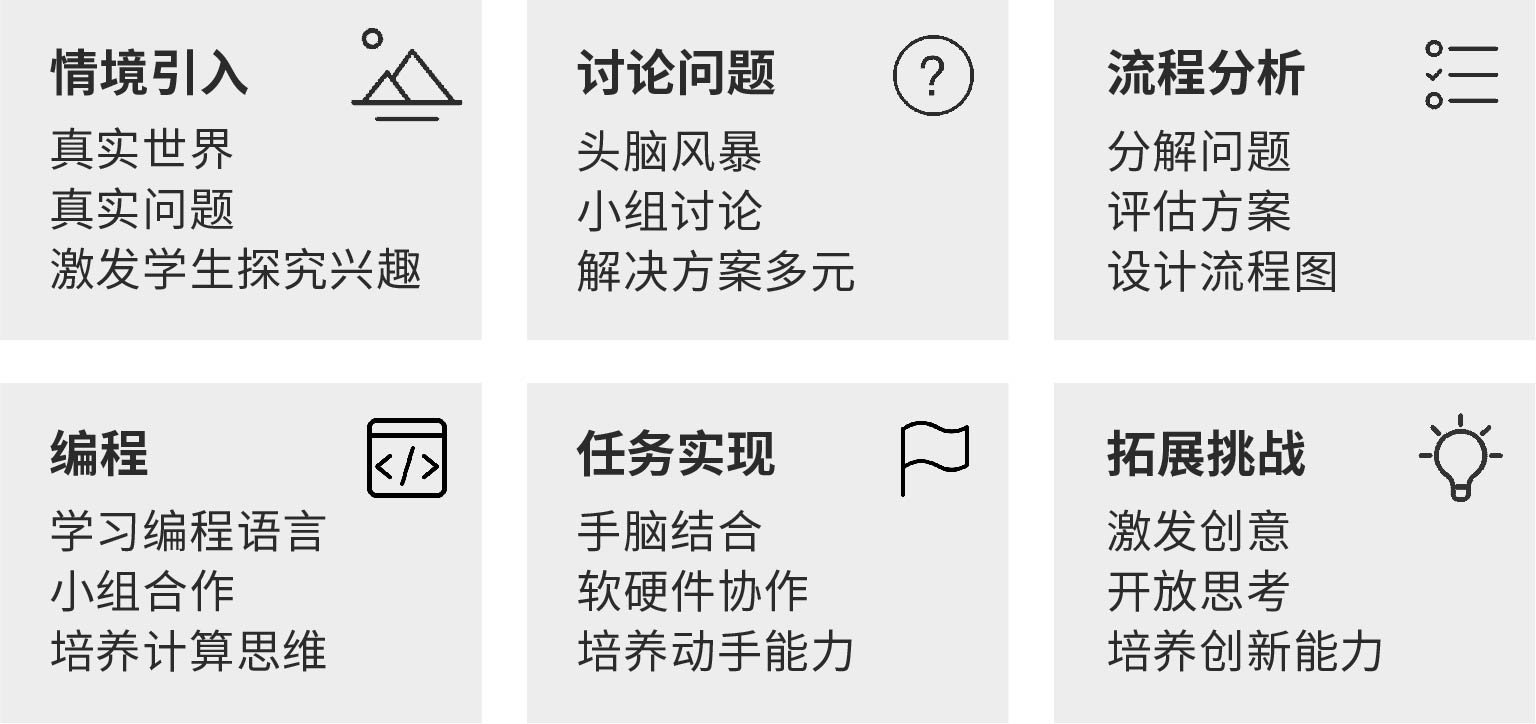 越疆科技人工智能創新教育解決方案以系統學習人工智能知識體系為核心,采用 PBL 教學模式,引導學生從現實問題出發,通過模擬搭建人工智能實際應用場景展開探究式學習,最終完成知識建構與能力提升。