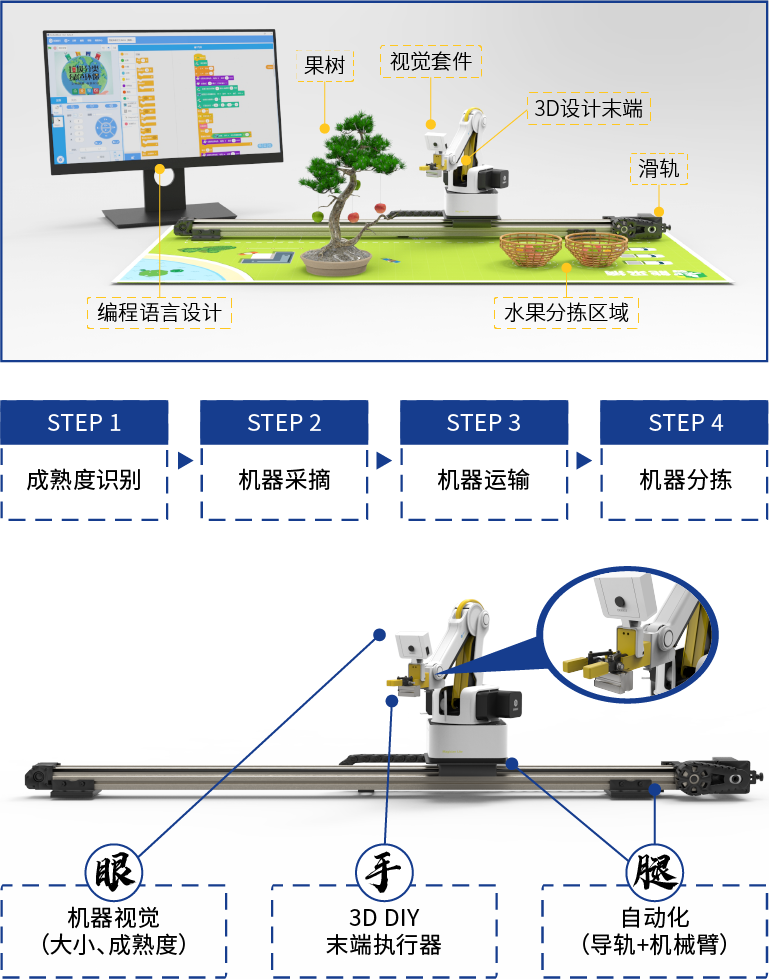 首先,學生會對智慧農業實際問題的社會與經濟效益展開分析,梳理構建案例流程框圖,挑選或自主設計配件,然后搭建一個小型智慧農業系統,利用 3D 建模設計 DIY 末端執行器,模擬人手抓取水果;再利用機器視覺技術,對水果的成熟程度、形狀大小、位置等信息進行識別;最后通過智能程序算法賦能機械臂完成對水果的采摘、分類等任務。項目實現了水果采摘全自動化,避免了采摘過程中對水果的損壞,對提高水果采摘效率具有重要意義,引發學生對人工智能在智慧農業等社會場景中的深入思考,鍛煉學生的工程思維與創新能力。