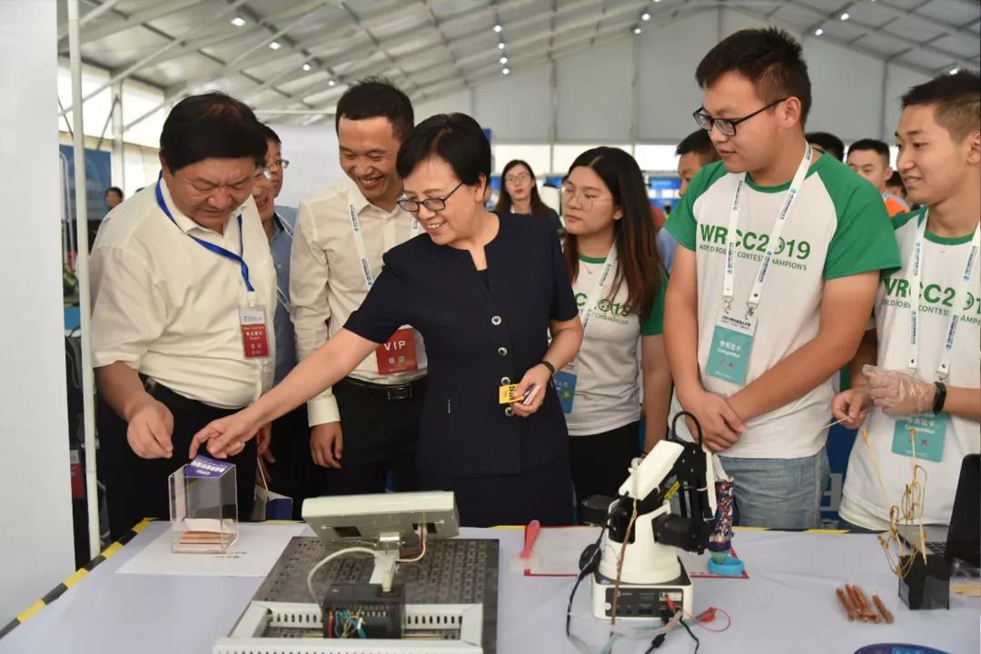 隨后,在 2019 世界機(jī)器人大賽機(jī)器人工業(yè)設(shè)計大賽冠軍挑戰(zhàn)賽的現(xiàn)場,魯昕會長向?qū)W生們詳細(xì)了解了 RFID 外殼定制及視覺檢測封裝流水線、超市智能散裝稱重系統(tǒng)、糖畫 DIY 機(jī)器人、智能涂膠機(jī)器人、基于磁阻變化的鐵氧體磁環(huán)表面缺陷無損檢測系統(tǒng)等工業(yè)機(jī)器人的設(shè)計思路與商業(yè)價值,并親自投票最具商業(yè)價值獎、最佳藝術(shù)獎、最佳創(chuàng)意獎的作品,鼓勵各院校師生們繼續(xù)努力。