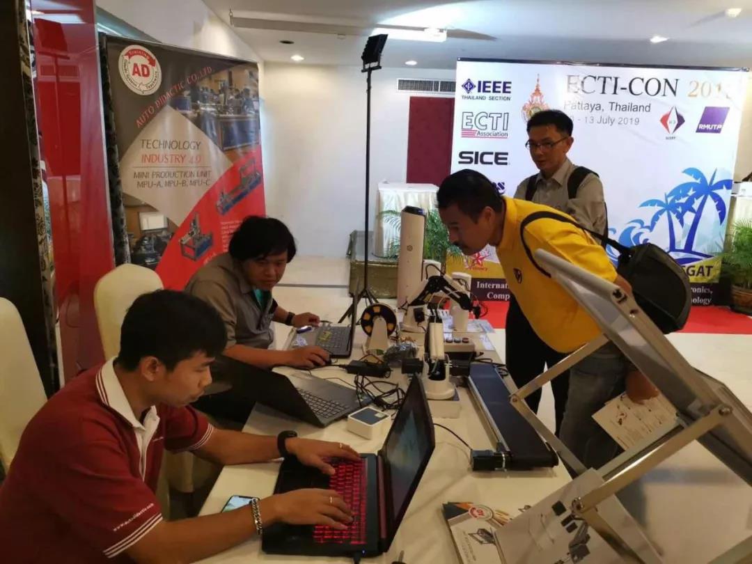 7 月 10 — 12 日,2019 泰國計算機電子信息技術國際會議 ECTI - CON 在泰國芭堤雅如期舉行。越疆泰國合作伙伴在現場展出了包括 DOBOT 魔術師、DOBOT M1、傳送帶套件、視覺套件等系列產品,旨在激勵泰國年輕人發現科學技術的重要性,鼓勵他們用科學的方式去思考和學習人工智能和機器人技術。