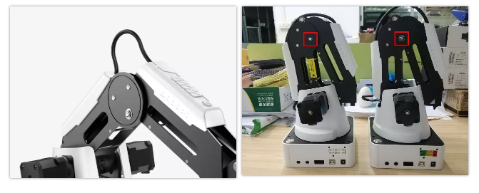 V1 版的大臂和小臂采用連桿的連接方式,V2 版進行了結構設計優化,變更為軸承+連桿,提高了機械臂運行軌跡的精準度,如:激光雕刻,寫字畫畫的軌跡更準確,連續等。
