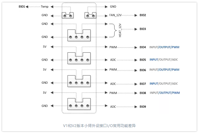 V1 的底座接插口和小臂接插口顏色都為白色,V2 接插口顏色做了變更,方便用戶進行區分,防止誤操作,通用口 GP 類用了綠色,12V 開關類 SW 用了紅色,電機接口 Stepper 用了黃色,3D 打印熱敏電阻用了藍色。