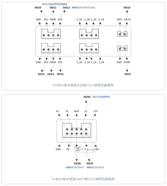 其中,藍色字體表示該功能 V1 和 V2 版本均支持,灰色字體表示僅 V1 版本支持。其余 I/O 引腳復用說明無標識,表示 V1 和 V2 版本 I/O 接口復用功能無變化。