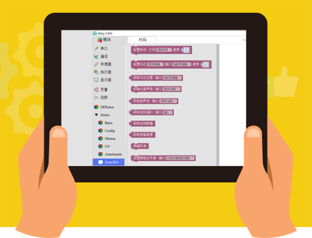編程是未來(lái)世界的通用語(yǔ)言,小車(chē)搭配兼容 Arduino 的圖形化編程軟件,圖形化編程界面,簡(jiǎn)單拖拽即可完成編程,使整個(gè)過(guò)程更像是一種游戲,讓編程更加生動(dòng)。