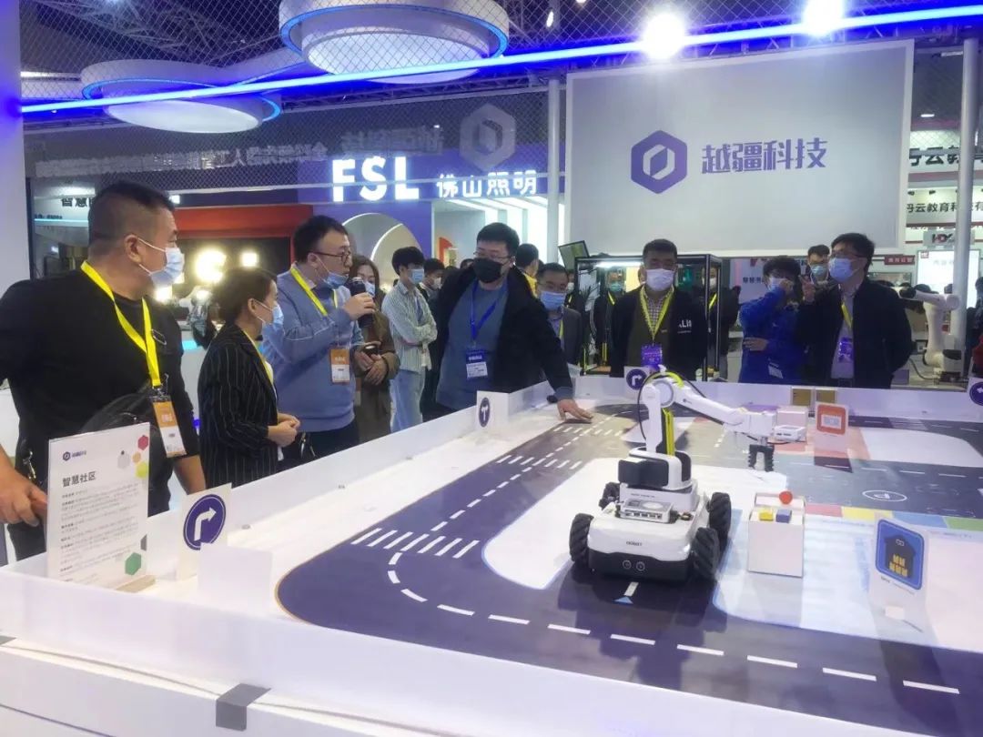 展會上,越疆科技以智能移動機器人 Magician Go 為核心移動載體,搭載 Magician Lite 桌面機器人,模擬搭建”智慧社區“場景,基于自動駕駛等技術實現社區內各類物資的精準配送。“智慧社區”作為綜合性極強的應用場景,涵蓋政務、商務、娛樂、醫護等各個方面,學生可搭建如智能垃圾分類、智能門禁、智能家居等更加完善的智慧社區服務系統,基于信息化、智能化社區管理與服務的新理念,學習更高層次、更復雜的人工智能系統,深刻體會人工智能等信息技術對未來生活方式帶來的巨大影響,進而思考如何運用科學技術改善人民生活,推動社會發展。