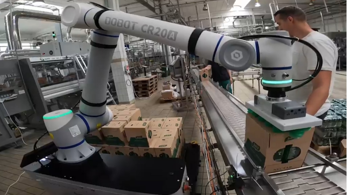 通過簡單配置,協作機器人可以精確且快速地將瓶裝飲料、罐頭食品或包裝零食的不同堆疊箱放置到托盤上。這包括堆疊單層或雙層箱子、添加層板或創建更復雜的堆疊排列。協作機器人還能確保箱子方向一致,這提高了托盤的穩定性和均勻性,對安全高效的運輸至關重要。